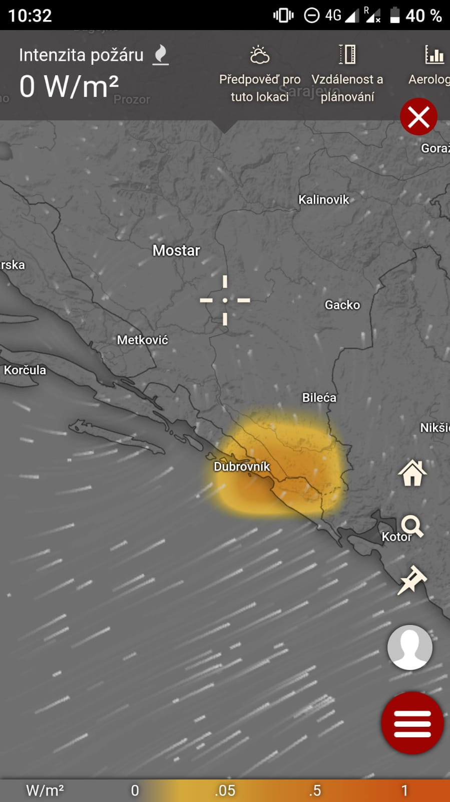 Pokud chcete vědět, kde aktuálně hoří, doporučuji vám českou aplikaci Windy. Můžete se na ni dívat v prohlížeči svého počítače nebo si ji nainstalovat do telefonu či tabletu jaako aplikaci. Windy má jako jednu z vrstev, které si můžete zapnout, volbu “Intenzita požáru”. Níže je například snímek ze středečního dopoledne, kdy hořelo u Dubrovníku - v mapě je to oranžově.